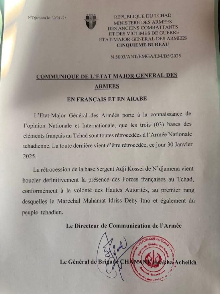 Début janvier, le Tchad avait donné jusqu’au 31 janvier 2025 aux forces armées françaises pour quitter son sol.