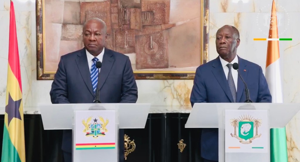 En visite à Abidjan, le Président ivoirien Alassane Ouattara a demandé à son homologue du Ghana John Dramane Mahama de convaincre l’Alliance des États du Sahel (AES) de rester dans la Communauté économique des États de l’Afrique de l’Ouest (Cedeao). Les deux chefs d’État ont évoqué plusieurs sujets, la Défense, la sécurité, l’économie, les mines, l’énergie, le Cacao et les grands chantiers de la Cedeao, l’ECO, la nouvelle monnaie.