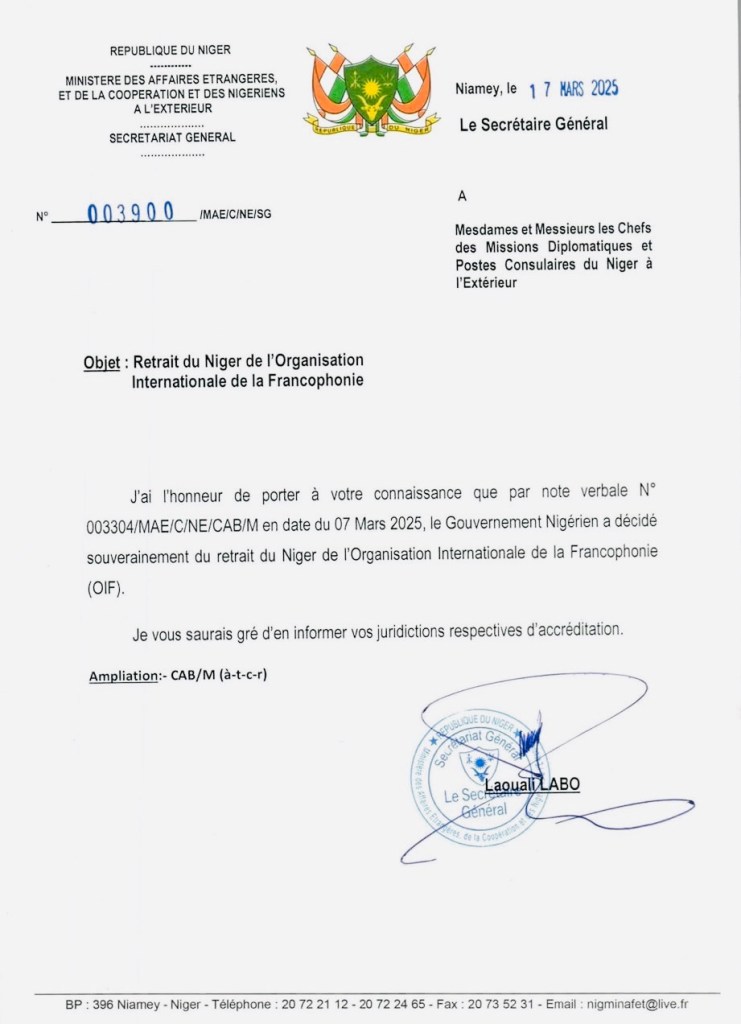 Le gouvernement nigérien a annoncé, lundi 17 mars 2025, le retrait du pays de l’Organisation Internationale de la Francophonie (OlF).
