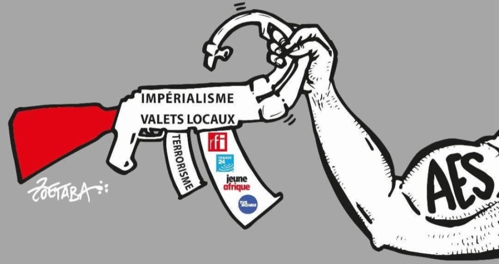 L’une de ses dernières caricatures a explosé et fait le tour des médias sociaux. Un bras, celui de l’Alliance des États du Sahel (AES), tordant le bout d’une kalachnikov. A l’intérieur de l’arme de guerre, le caricaturiste représente des médias français, l’impérialisme et le terrorisme. L’image ainsi réalisée est en quelque sorte la résilience et le combat des pays du Sahel contre le terrorisme, l’impérialisme et la manipulation des médias occidentaux notamment français.