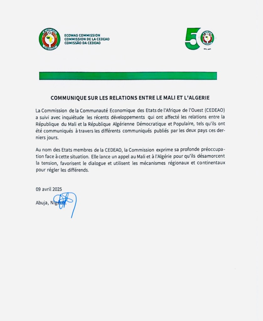 La Cedeao a dit, mercredi 9 avril 2025, être préoccupée par la situation entre le Mali et l’Algérie et a appelé les deux pays au dialogue utilisant, dit-elle, « les mécanismes régionaux et continentaux pour régler les différends ».