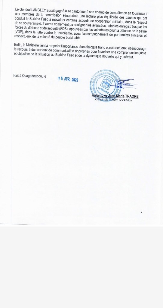 « En avançant que les ressources minières du Burkina Faso, ainsi que certains revenus issus de la coopération avec la République populaire de Chine, ne profiteraient pas à la population et serviraient plutôt à la protection du ‘’régime en place’’, le Général Langley adopte une posture qui nie délibérément la nouvelle dynamique souverainiste du Burkina Faso », peut-on lire dans la note du ministère précisant que de « tels propos, légers, infondés et éminemment politiques, sont d’autant plus préoccupants qu’ils ont été tenus dans le cadre d’une instance parlementaire aussi prestigieuse que le Sénat américain, par un haut responsable militaire ».
