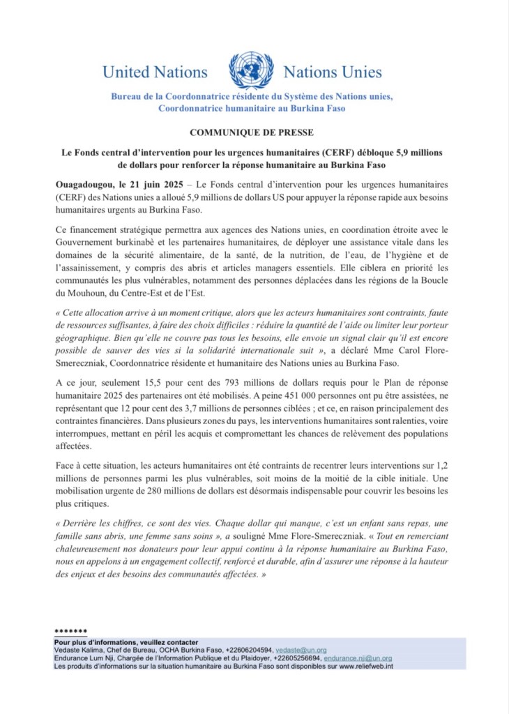 Dans un communiqué de presse samedi 21 juin 2025, les Nations unies à travers sa représentation au Burkin Faso a annoncé une allocution de 5,9 millions de dollars US, plus de 3 milliards 358 millions de FCFA, au pays pour faire face aux « urgences humanitaires ». L’allocution est du Fonds central d’intervention pour les urgences humanitaires (CERF) des Nations unies pour « appuyer la réponse rapide aux besoins humanitaires urgents au Burkina Faso », selon le communiqué.