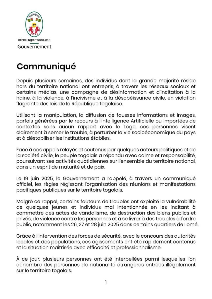 Le gouvernement togolais a condamné « avec fermeté », dimanche 29 juin 2025 dans un communiqué, les « actes de déstabilisation et de violence tendant à porter des atteintes graves à la tranquillité et l’ordre publics, à propager la violence sous toutes ses formes et à remettre en cause l’ordre constitutionnel ».