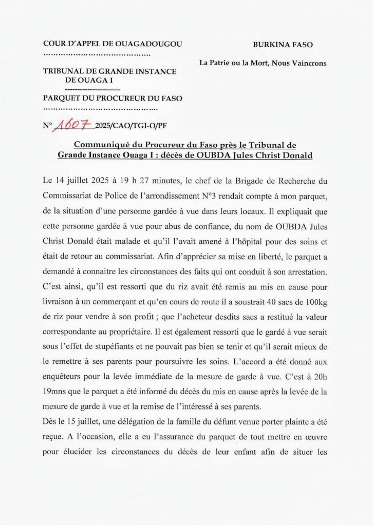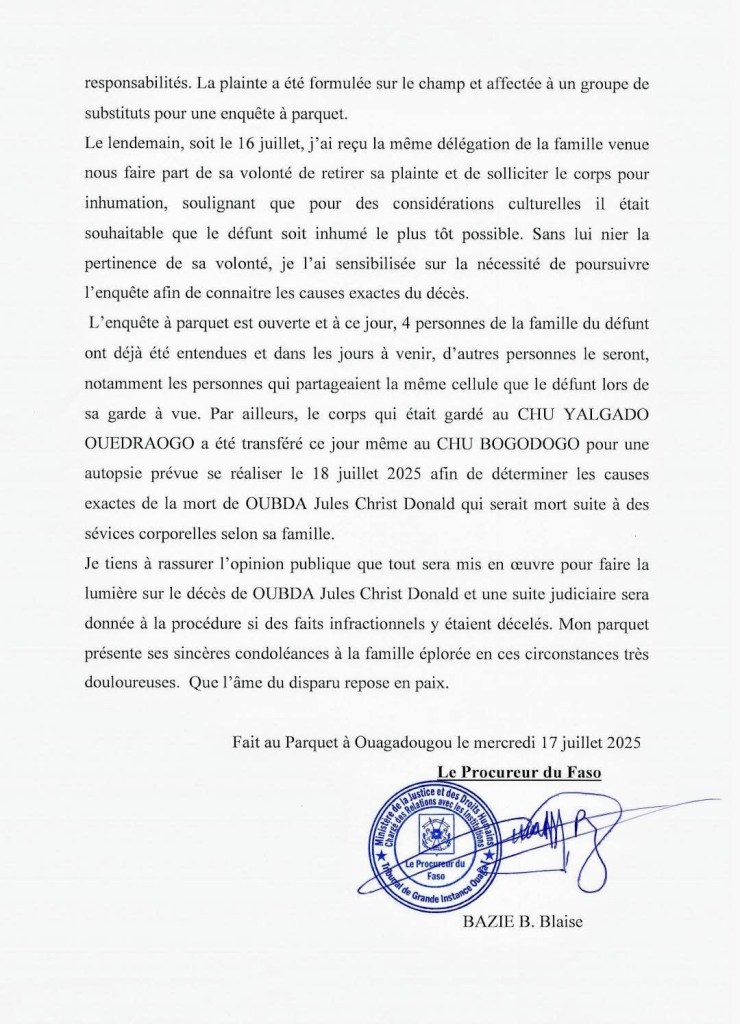 Le procureur a annoncé, jeudi 17 juillet 2025, l’ouverture d’une enquête pour situer les responsabilités dans le décès du jeune Donald Oubda. « Je tiens à rassurer l’opinion publique que tout sera mis en œuvre pour faire la lumière sur le décès de Oubda Jules Christ Donald et une suite judiciaire sera donnée à la procédure si des faits infractionnels y étaient décelés », a assuré le procureur Blaise Bazié.