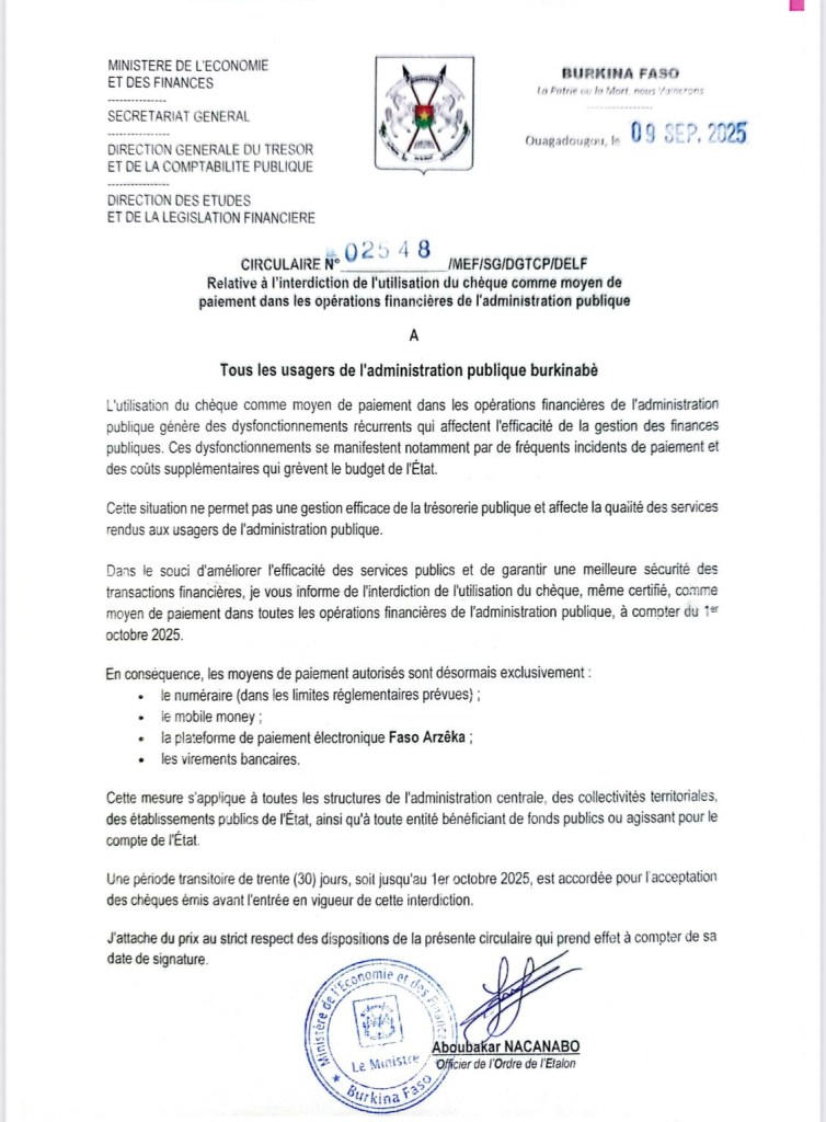« Une période transitoire de trente (30) jours, soit jusqu’au 1er octobre 2025, est accordée pour l’acceptation des chèques émis avant l’entrée en vigueur de cette interdiction », a indiqué Aboubacar Nacanabo.