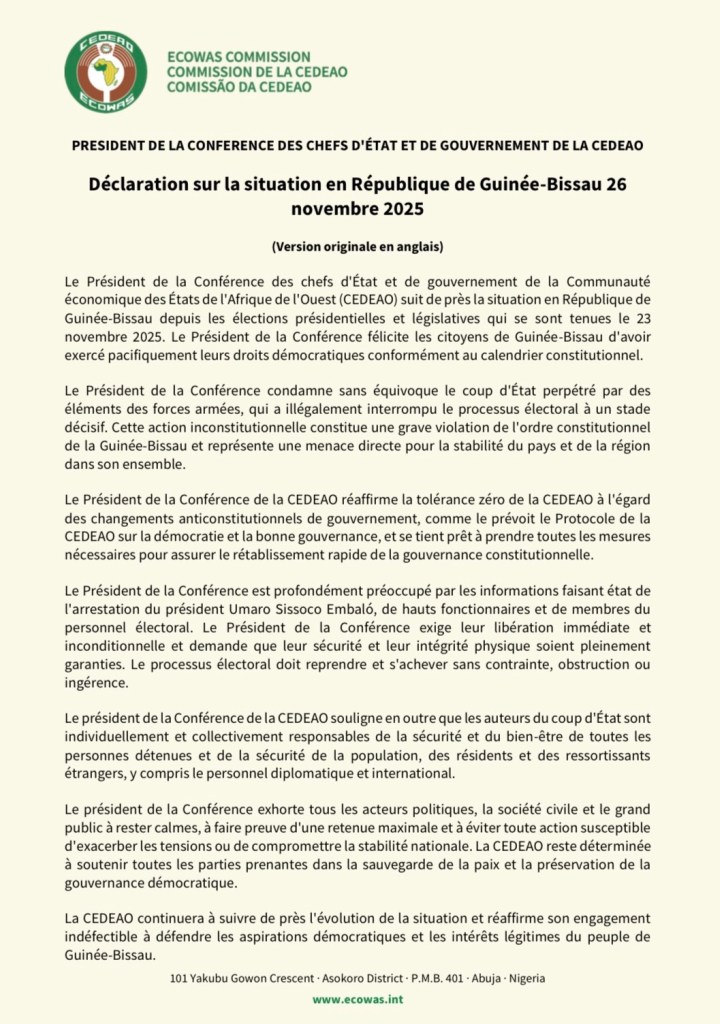 Les chefs d’État de la Communauté économique des États de l’Afrique de l’Ouest (Cedeao) ont condamné – « sans équivoque » – le coup d’État, disent-ils, perpétré par des « éléments des forces armées, qui a illégalement interrompu le processus électoral à un stade décisif ».