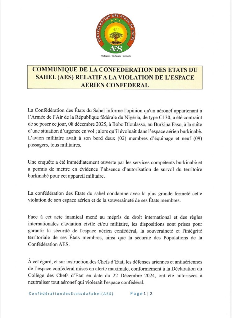 La Confédération des États du Sahel a condamné, lundi 8 décembre 2025, la violation de son espace aérien par un aéronef appartenant à l’Armée de l’Air de la République fédérale du Nigéria.