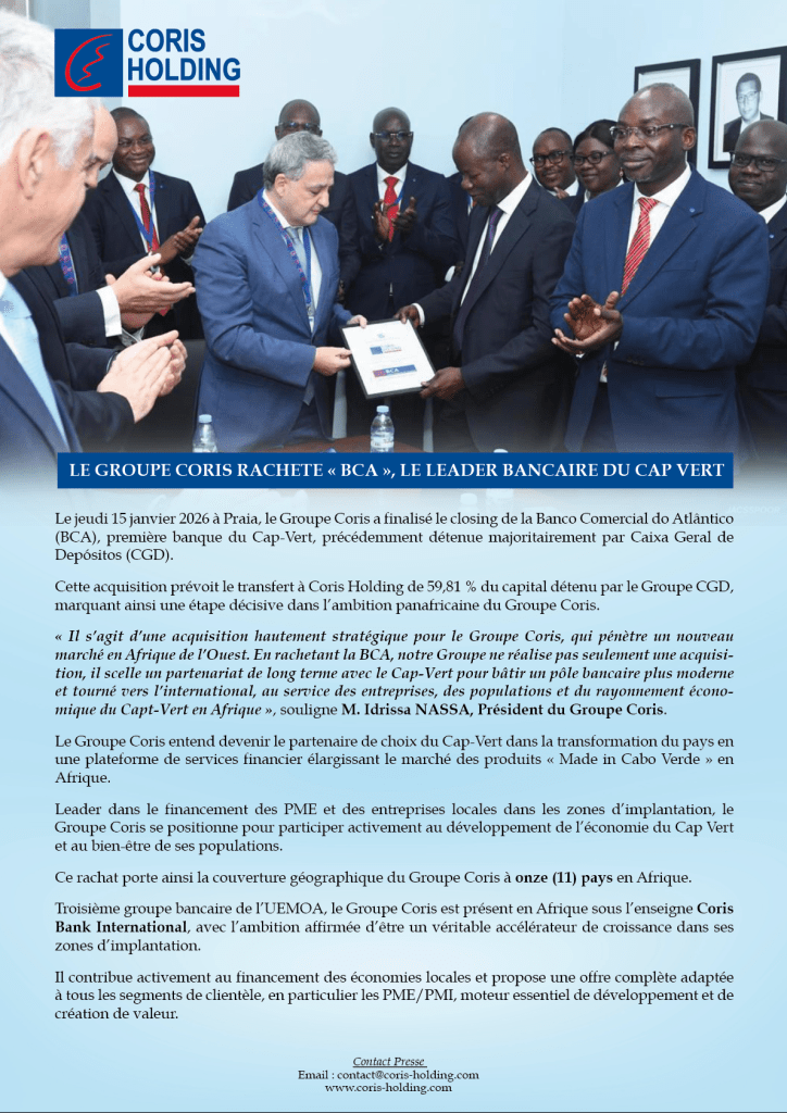 Le Groupe Coris du Burkinabè Idrissa Nassa a annoncé, vendredi 16 janvier 2026, le rachat de la Banco Comercial do Atlântico (BCA), la première banque du Cap-Vert marquant ainsi, l’implantation du groupe bancaire burkinabè dans ce pays. Le deuxième pays lusophone – après la Guinée-Bissau – où le groupe acte son implantation.