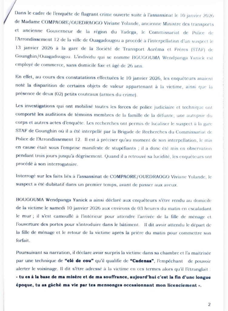 Un suspect a été arrêté dans le cadre de l’enquête sur l’assassinat de Viviane Compaoré Ouedraogo, ancienne ministre des Transports et ex-gouverneure de la région du Yadéga, tuée le 10 janvier 2026 à Ouagadougou, a annoncé le parquet du Tribunal de grande instance Ouaga II ce lundi 19 janvier 2026 lors d’une conférence de presse tenue à Ouagadougou.