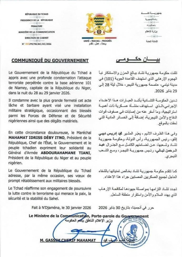 Le gouvernement tchadien a condamné, vendredi 30 janvier 2026, l’attaque de l’aéroport de Niamey au Niger qu’il qualifie d’acte « lâche et barbare ». Le pays a exprimé sa solidarité au Président Tiani et au Peuple nigérien, précise le communiqué.