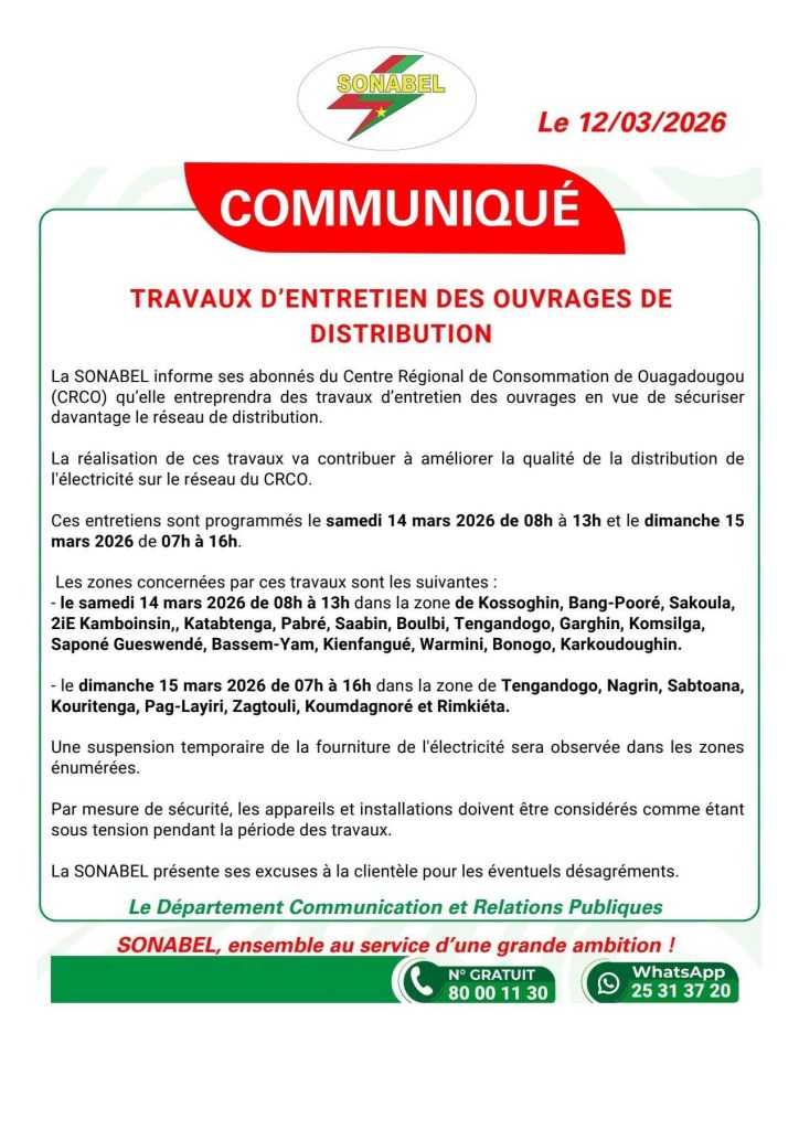 La Société Nationale d’Électricité du Burkina (SONABEL) a annoncé, jeudi 12 mars 2026, des travaux d’entretien des ouvrages de distribution. Ces travaux d’entretien des ouvrages – en vue de sécuriser davantage le réseau de distribution – vont concerner ses abonnés du Centre Régional de Consommation de Ouagadougou (CRCO).