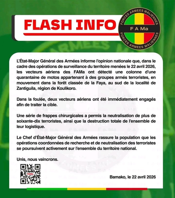 Au moins 130 terroristes ont été tués dans deux opérations distinctes. Déjà, le mercredi 22 avril 2026, lors d’une opération de surveillance, les FAMa expliquent, que les vecteurs aériens des FAMa ont détecté une colonne d’une quarantaine de motos appartenant à des groupes armés terroristes, en mouvement dans la forêt classée de la Faya, au sud de la localité de Zantiguila, région de Koulikoro.