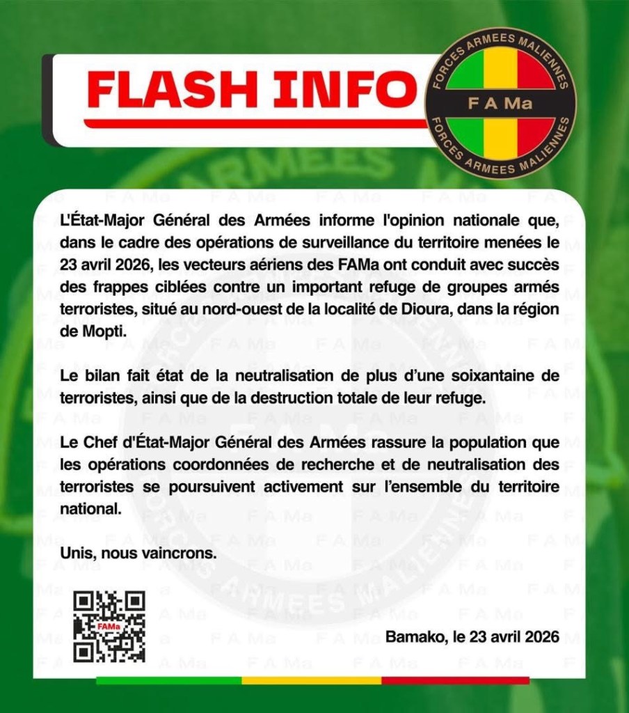 Et ce jeudi 23 avril 2026, les vecteurs aériens de l’armée malienne ont conduit avec succès des frappes ciblées contre un important refuge de groupes armes terroristes, situé au nord-ouest de la localité de Dioura, dans la région de Mopti. « Le bilan fait état de la neutralisation de plus d’une soixantaine de terroristes, ainsi que de la destruction totale de leur refuge », assurent les forces armées maliennes.
